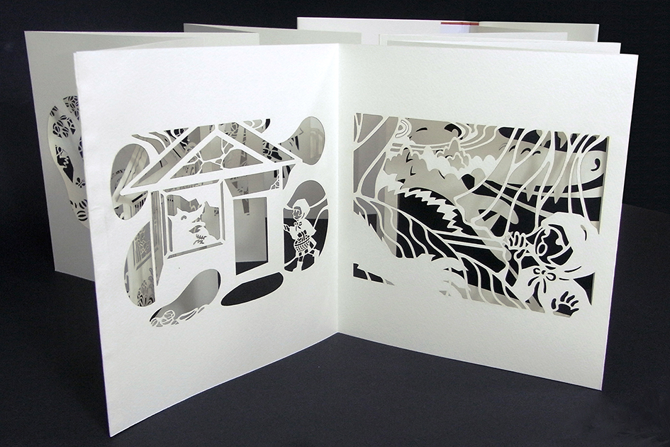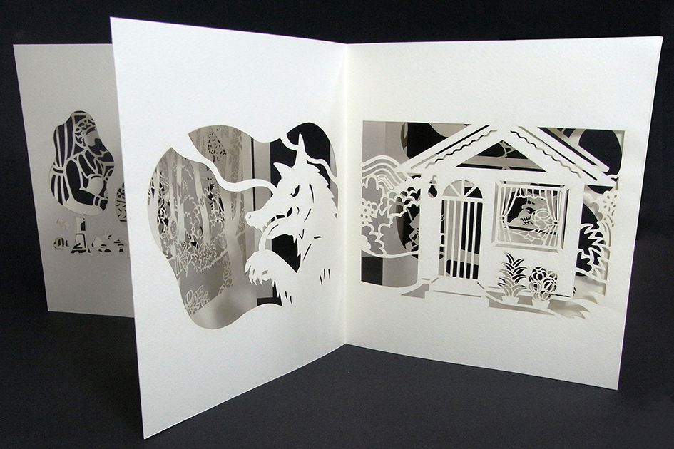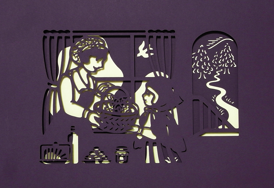 Each scene consists of 2~3 sheets of paper. For example, these 3 images are from the first scene: Ms. Riding-hood receives a basket from her mother(left), the second paper slides in and the scenery outside the window emerges(center), remove the first paper then the girl is outside and about to enter the forest(right).